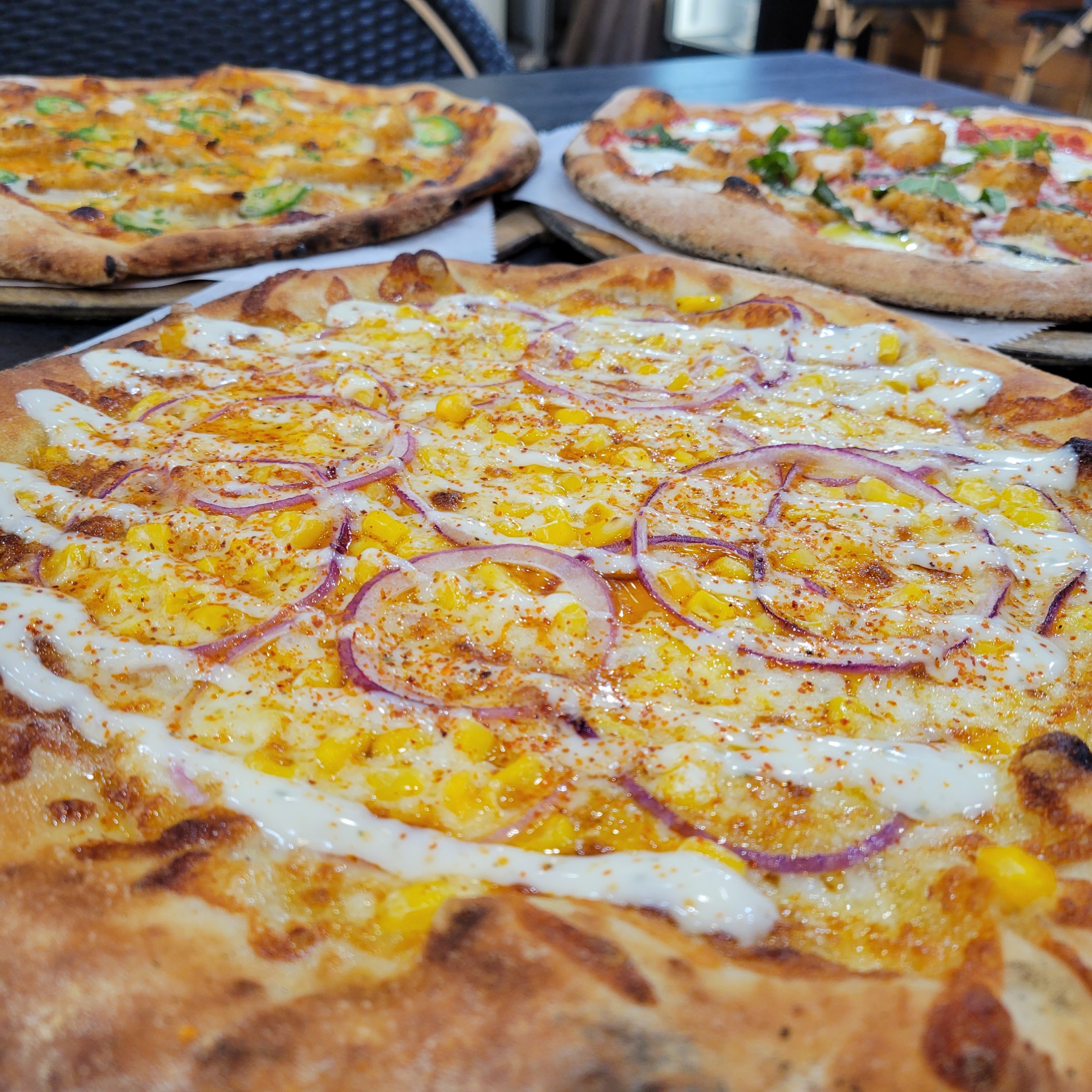 Roasted corn, red onion, and house blend cheese over seasoned mascarpone spread; finished with lime crema & Tajin