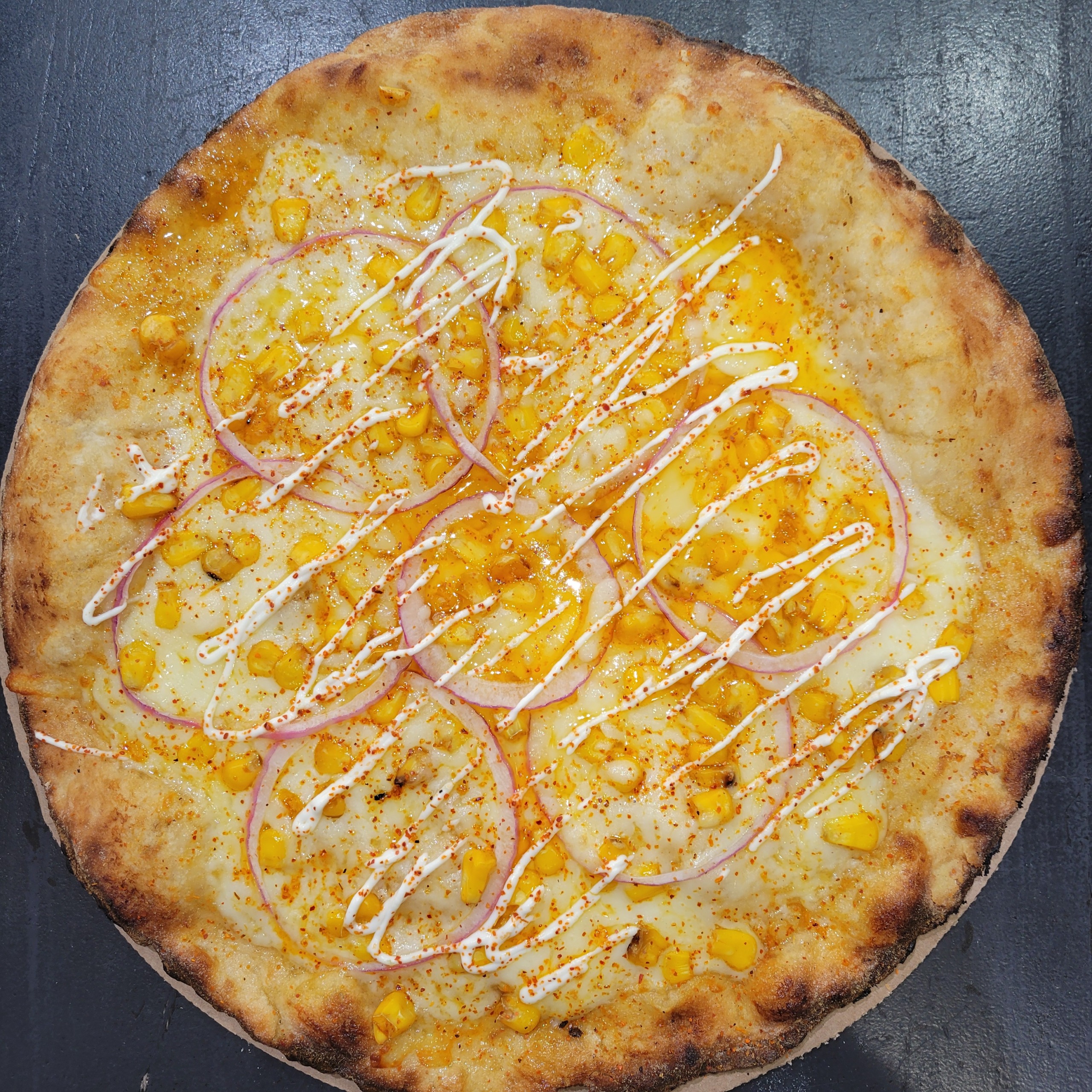 (5) Roasted corn, red onion, and house blend cheese over seasoned mascarpone spread; finished with lime crema & Tajin