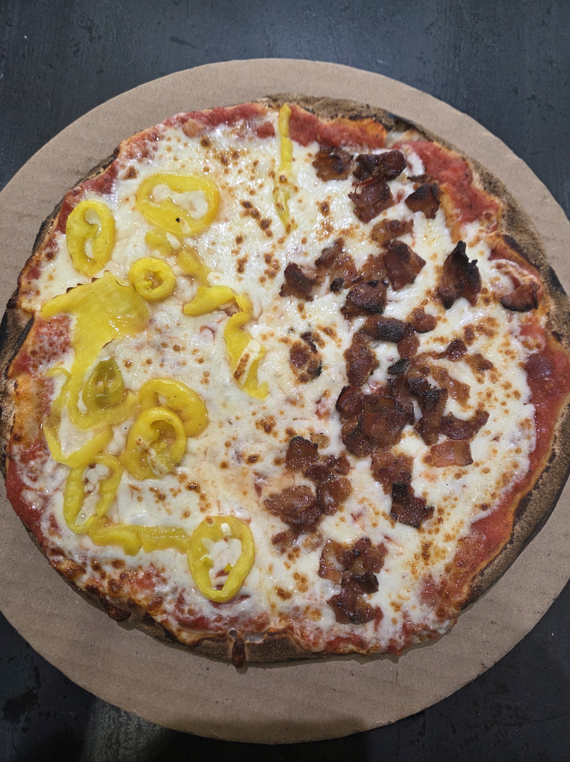 (5) Half bacon, half banana peppers, and our house blend cheese over red sauce.